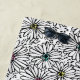 Patrón con ilustraciones de margaritas negras y blancas con centros coloridos en amarillo, rosa y azul.