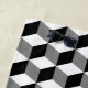 Cubos 3D en un diseño geométrico de superficie repetida en fondo negro, blanco y gris.