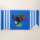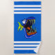 Una vibrante toalla de playa a rayas azules con un colorido y agudo pez pirana dentada con puntas en el centro.