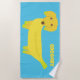¡Es un perro! ¡Es un plátano! ¡Es un perro hecho de plátanos! Esta toalla de playa tiene un ilustracion gracioso de un perro dachshund hecho de plátanos amarillos colocados sobre un fondo azul brillante. Hay un punto para agregar un nombre en las letras amarillas coincidentes.