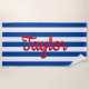 Esta toalla de playa tiene rayas azules y blancas. Personalice esta toalla de playa con el nombre o el texto de su elección, que aparece en un gran tipo de letra roja a lo largo de la toalla.