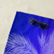 El diseño de la palma es audaz, luminoso y tropical, en tonos violeta y azul y blanco.