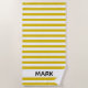 Una impresionante toalla de playa a rayas amarillas y blancas. Personalice con su nombre.