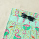 Este modelo bonito, original del flamenco tiene una torsión retra del art déco con un adorno geométrico. Hecho en sombras brillantes del naranja rosado y de oro en un campo del verde alegre del verano, este modelo elegante, tropical también incluye las frondas del helecho. Personalice esta toalla de playa con su nombre. Cuando usted utiliza la plantilla del texto, su nombre aparecerá en ambos extremos de la toalla (upside-down en el top, para la visión fácil mientras que usted está tomando el sol). ¡Dirija a la playa en estilo con esta toalla hermosa del flamenco!