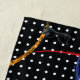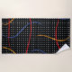 El estilo retro de los años 1980, la pintura de color primario traza un patrón de salpicadura en un fondo geométrico con puntos en blanco y negro.