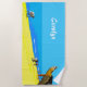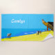 Esta toalla de playa cuenta con una fotografía de arte digital de Benaulim Beach en Goa, India, y puedes personalizarla con tu nombre. La impronta está estilizada y muestra la inmensa playa de amarillo intenso frente a un mar y un cielo azul turquesa. El arco de un barco local con cuentas está a la derecha y se pueden ver vacas y ciclistas en la playa. Los colores principales son la arena amarilla y el azul turquesa del cielo.