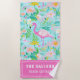 El diseño de toallas de playa puede incluir una impresión de verano con flamencos. Puedes personalizar tu nombre de familia o tu nombre de Air BNB. Estas toallas son perfectas para una casa de vacaciones en la playa o para alquilar.