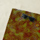 Bandas amarillentas inclinadas que en partes son opacas o manchadas y perforadas de manera que generan un efecto a cuadros quemados.