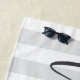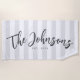 Esta toalla de playa tiene un sutil fondo de rayas grises con el nombre de la familia y el año establecido. Un regalo para una pareja recién casada por su regalo boda. También puede hacer un gran regalo de aniversario.