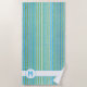 Toalla de playa verde azulada, azul, verde y blanca. Crisp y contemporáneo con un ambiente de los años 70. Un lugar de diseño para complementar la decoración de la piscina o el día en la playa. Agregue un nombre o cambie el monograma al personalizar. Hay accesorios gratuitos disponibles.
