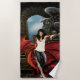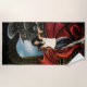 Una mujer de cabello negro con zapatillas, jeans y una camiseta de tanque. La mujer sostiene una espada y un dragón rojo está a su lado en un castillo.