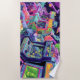 Retro arcade machines are nestled among vibrant planets and stars. The scene combines nostalgia with a colorful cosmic theme.