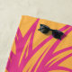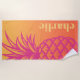 Toalla de playa con una piña rosa caliente y tu nombre o texto personalizado alineado verticalmente a la derecha sobre un fondo degradado de amarillo a naranja.
