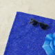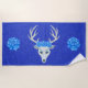 Esta toalla de playa personalizado es de un azul oscuro y vibrante, con pequeñas motas blancas y la cabeza de un ciervo blanco con grandes antorchas blancas con rosas azules. También hay un rosa azul en cada extremo de la toalla.