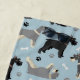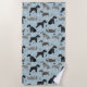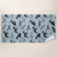 Perros Schnauzer en negro, sal, pimienta y abrigos negros y plateados sentados, de pie y girando con huesos de perro dispersos y huellas de pata en un fondo azul claro.