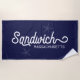 Esta toalla de playa muestra el texto Sandwich, Massachusetts con un tipo de letra náutica blanca con acentos de estrella. El fondo está a la sombra de la marina, aunque se puede cambiar a cualquier color que se desee. Perfecto para la decoración de playa, costera o náutica.