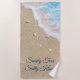 Esta toalla de playa está decorada con hermosas olas azules que se sumergen en una suave arena de playa cubierta de conchas de bonito. El personalizable dice: Sandy toes Salty Kisses.