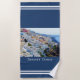 Toalla de playa azul de 70" x 35" de la isla griega de Santorini, clásica Thera y oficialmente Thira. Bordes de doble franja blanca. Santorini es una isla situada en el sur del Mar Egeo, a unos 200 km al sudeste de Grecia continental. Es la isla más grande de un pequeño archipiélago circular que lleva el mismo nombre y es el remanente de una caldera volcánica. Vea toda la colección de toallas de playa de Grecia en la sección HOME.