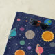 Un divertido y moderno patrón de sistema solar con planetas coloridos, estrellas y ilustraciones solares en un fondo azul oscuro.