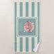 Toalla de playa en verde azuladas rayas beige para los turistas, residentes o propietarios de casas de playa o de negocios de St Saint Tropez France. El nombre y los textos son personalizables según las necesidades individuales.
