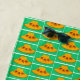 Dibujo gráfico, de gorra amarillo brillante con flores de girasol, sobre el fondo, con adorno naranja en el fondo, verde lima.
