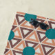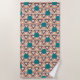 Esta toalla de playa tiene un diseño geométrico de triángulos marrones y marrones que se repiten con círculos turquesas sobre un campo de blanco roto. ¿Quieres el mismo diseño en colores diferentes? Mándame un mensaje.