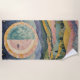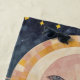 Se trata de una pintada de paisaje caprichosa y simbólica que presenta una vasta ladera rodante bajo un cielo celeste. Las colinas se representan en una serie de líneas amplias y onduladas y en una paleta muda de verdes, amarillos, azules y rosas suaves, lo que sugiere un terreno fértil y de ensueño. El primer plano está repleto de una densa variedad de plantas estilizadas y flores. Dominando el cielo se encuentra una gran orbe central que representa una cara celeste, dividida entre un perfil humano y un patrón geométrico, de mosaico. El cielo de arriba es un índigo profundo, salpicado de estrellas doradas, con una luna llena visible a la derecha. El estilo es muy decorativo y folclórico, con una sensación de armonía cósmica y maravilla natural.
