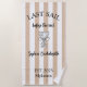 ¡Celebra a la futura novia con estilo con esta toalla de playa personalizada Última Vela Antes del Velo! Con suaves rayas beige y blancas neutras, una ilustración de copa de champán celebratoria y campos de texto personalizados para el nombre de la novia, el año del evento y la ubicación, es el regalo perfecto para fiestas de despedida de soltera en la playa o fines de semana de boda en destino. Elegante pero divertida, esta toalla es imprescindible para cualquier escapada de grupo de novia.