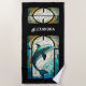 Toalla verde azulada de playa de cristal lacado con aspecto de delfín blanco y azul. Es perfecto para cualquier ocasión. Este diseño tiene muchos productos a juego. Luz tamizada de diseño submarino con un delfín de vidrio perlizado