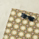 Un patrón geométrico con un diseño repetitivo cubre todo el espacio, con una mezcla de elementos de color abeja y floral. Diversos tonos marrones, beige y amarillos crean un ambiente vintage o retro.