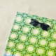Un patrón geométrico con un diseño repetitivo cubre todo el espacio, con una mezcla de elementos de color abeja y floral. Los diferentes tonos verdes, blancos y azules crean un ambiente divertido.
