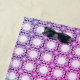 Un patrón geométrico con un diseño repetitivo cubre todo el espacio, con una mezcla de elementos de color abeja y floral. Diversos tonos morados, rosas y azules crean un ambiente vintage o retro.