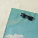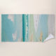 Un cuadro sereno y luminoso de una tranquila escena playera. La composición está dividida en un cielo suave con nubes blancas onduladas, una amplia extensión de un océano azul turquesa con olas suaves y espumosas y una orilla de arena. La playa es de color crema suave y blanco, con sutiles impresiones de agua que atraviesa la arena. En primer plano, un conjunto de plantas estilizadas verdes y azules aportan un toque natural de detalle. El paisaje de fondo es una costa verde y distante, bajo un cielo despejado. El estilo es fluido y suave, con una armoniosa paleta de azul pastel, verdes y blancos que evocan un ambiente tranquilo y de ensueño.