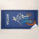 This beach towel is ready to be personalized with a name or other custom text. It features my hand drawn illustration of a werewolf skeleton riding a BMX bike. The comic book style graphic is in ivory, aqua blue and orange and set against a darker blue background. The edges of the towel have a blue on blue checkerboard pattern.