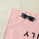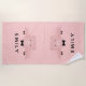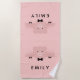Una toalla de playa personalizada con un dibujo de la cara de un bonito cerdo rosa. Llevando una corbata negra. Levantado por sus pezuñas negras y mirando hacia usted. Dibujo tierno y caprichoso. Envuelto en un fondo rosado con algunos corazones desvanecidos aquí y allá.