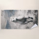 A powerful white horse running through shallow water with splashes flying around its hooves. The scene captures motion, freedom and the raw energy of a horse moving through an open landscape with mountains in the distance.