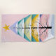 A vibrant, stylized composition depicting a Christmas tree in an abstract, layered landscape. The artwork features a distinct, dark central tree trunk and bare, snow-dusted branches reaching out across horizontal, triangular planes of color. These layers, rendered in soft pastel hues of pink, pale lavender, teal, and gold, suggest snow-covered tiers or an ethereal mountain range. A bright, golden, five-pointed star crowns the apex. The surface has a rich, textural quality, as if painted with thick paste or gouache. Gold accents highlight small, glowing spheres scattered across the branches and within the colorful layers, suggesting festive ornaments or winter light. The overall mood is cheerful, modern, and serene.