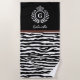 Esta elegante toalla de playa tiene un patrón de rayas de cebra animal en blanco y negro y un espacio para su nombre personalizado y monograma. El monograma aparece dentro de una corona y corona de laurel real. El diseño también incluye una elegante franja dorada rosa. Salón de lujo con esta hermosa toalla de playa de huella animal.