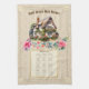 Hogar Sweet Home bonito cabaña floral toalla de calendario 2025 sobre fondo de damasco de color marrón.