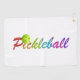 Un diseño colorido con la palabra "pelota" en tonos rojos, amarillos, verdes, azules, rosas y violetas sobre un fondo blanco opuesto. Hace un gran regalo personalizado para cualquier entusiasta del pickleball.