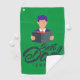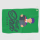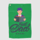 Toalla verde de golf con una foto de un hombre leyendo un libro.