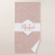 Los cuartos de baño cuentan con toallas de baño monograma rosado Purpurina. El diseño de las toallas tiene un fondo de color rosa purpurina con adornos para añadir tu nombre y monograma para la personalización. El purpurina es una ilustración representada y el elemento final no contendrá purpurina. Si necesitas ayuda con alguna personalización, por favor contacta conmigo directamente.