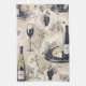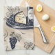 Moda, moderno diseño de toallas de cocina con elegantes vasos de vino, botellas de vino, uvas y bandeja de quesos, todo ello en un marco neutro y sofisticado