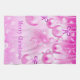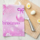 Dé un respiro a los colores de los Navidades tradicionales con esta moderna toalla de cocina con adornos de Navidad rosada. Cuenta con baudias y cintas colgantes rosas, arcos púrpuras, fucsia Texto de navidad sobre copos de nieve rosas y fondo de efecto luz bokeh.