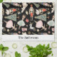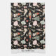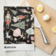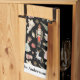 Navidades personalizados Nutcracker Kitchen Towel presenta caracteres de ballet peatonal y símbolos sobre fondo negro con nombre personalizado o apellido de la personalización del saludo de vacaciones.