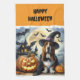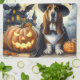 En esta toalla de cocina de Halloween se muestra una imagen adorable de un perro vestido de bruja, con murciélagos y calabazas. El mensaje en la toalla dice, "Feliz Halloween", ¡gran manera de decorar para la festividad! También hay un trivet y una almohadilla caliente disponibles en el mismo diseño.