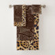 Estas toallas de color beige crema presentan un diseño de mosaicos inspirado en la fauna africana. Los motivos de chita bordeados se entrelazan con motivos geométricos en un rico marrón hershey, celebrando la belleza natural del continente.
