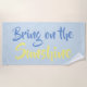 Disfrute de los cálidos meses de verano en la playa. Bring on the Sunshine se escribe en texto azul y amarillo sobre un fondo azul claro. Diseño original © TamiraZDesigns.