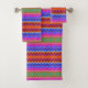 Toallas vibrantes cuelgan de una barra, luciendo un patrón zigzagueante colorido en tonos naranja, rosa, azul, verde y púrpura, creando una atmósfera animada y alegre.