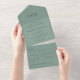 Tipografía verde y negra polvorienta, sólo texto, monogramado, minimalista, simple simple invitación a la boda, que incluye una postal rsvp desgarradora (3 en 1 según las imágenes). El elemento incluye la dirección del remitente, una dirección de devolución y campos de plantilla de texto para la ceremonia del boda y la recepción según desee (edite el texto para adaptarlo a sus necesidades específicas). También puede añadir iniciales de parejas, monograma. Invitación moderna y elegante, económica y acorde a sus necesidades.